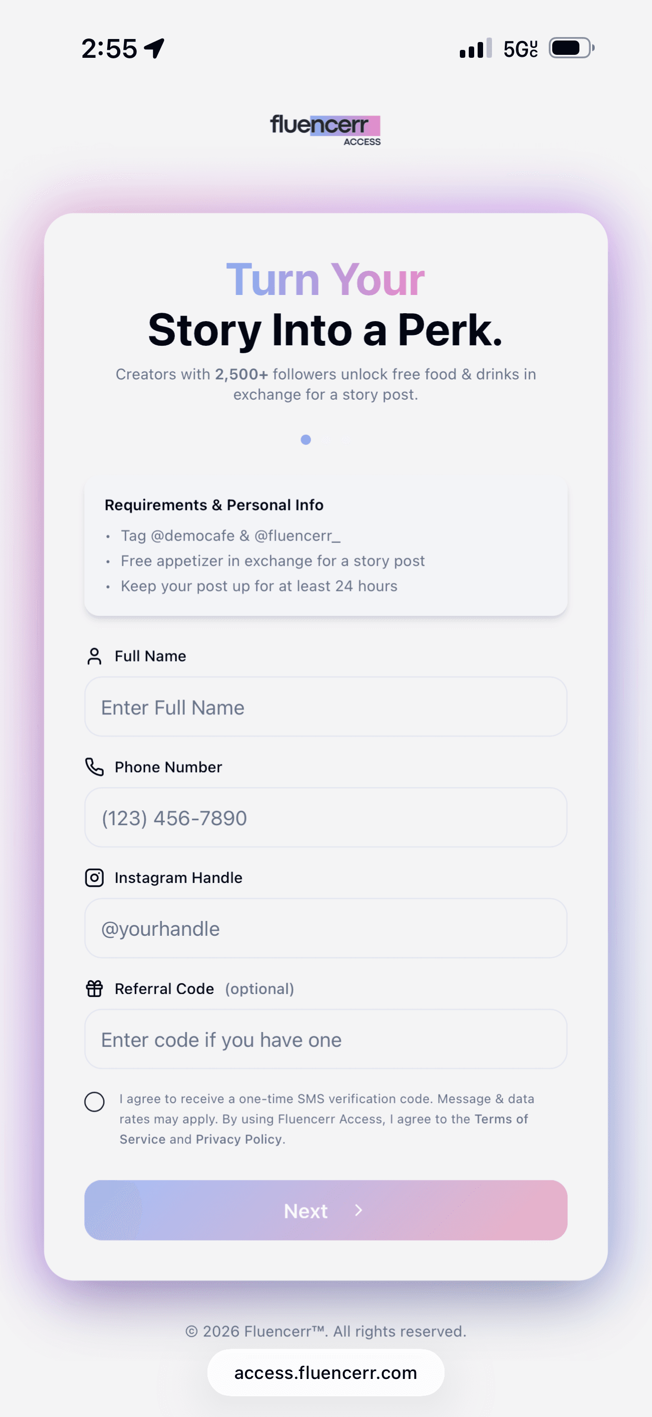 Fluencerr Access is for creators who meet minimum follower and engagement requirements set by each venue. Eligibility is checked instantly at scan.